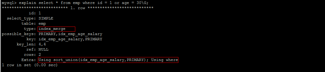 explain select * from emp where id = 1 or age = 30;