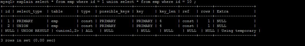 explain select * from emp where id = 1 union select * from emp where id = 10;