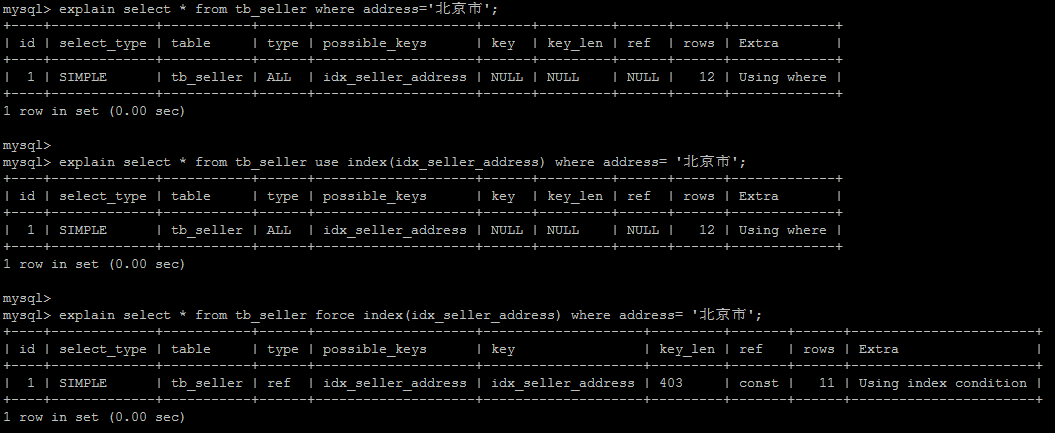 explain select * from tb_seller force index(idx_seller_address) where address='北京市';