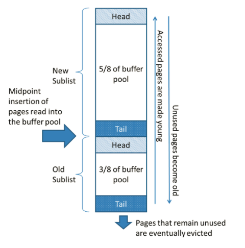 假如我们有一条查询语句非常大,返回的结果集直接就超过了16KB,而这种语句使用场景又是极少的,所以可能就会出现一次将缓存占满的情况,为了避免这种情况发生,InnoDB对传统的LRU算法又做了改进,将LRU列表分拆分为2个,如下图(图片来源于MySQL官网):
