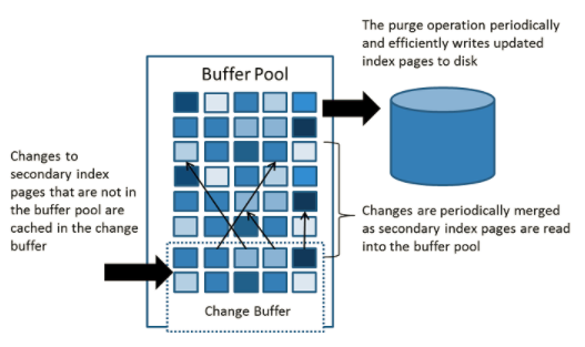 InnoDB在进行DML操作非聚集非唯一索引时,会先判断要操作的数据页是不是在Buffer Pool中,如果不在就会先放到Change Buffer进行操作,然后再以一定的频率将数据和辅助索引数据页进行merge。这时候通常都能将多个操作合并到一次操作,减少了IO操作,尤其是辅助索引的操作大部分都是IO操作,可以大大提高DML性能。