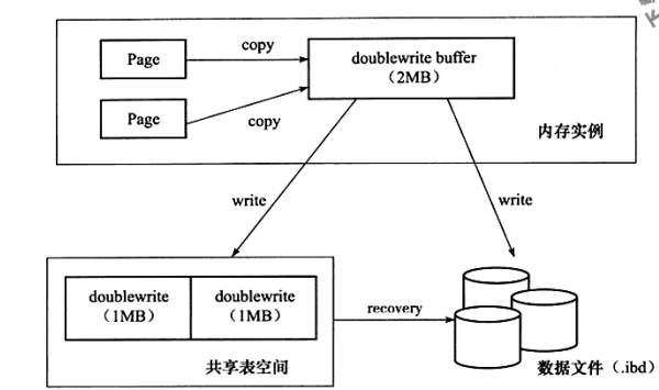 double write也是由两部分组成,一部分是内存中的double write buffer,大小为2MB,另一部分是物理磁盘上的共享表空间中的连续128个页,大小也是2MB,写入流程如下图(图片来源于《MySQL技术内幕 InnoDB存储引擎》):