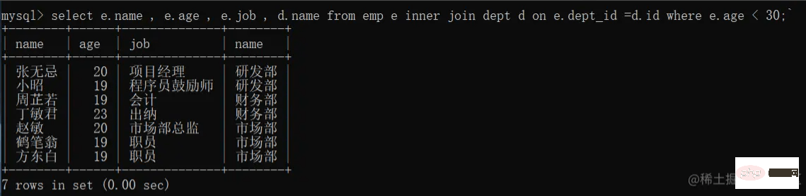 select e.name , e.age , e.job , d.name from emp e inner join dept d on e.dept_id =d.id where e.age < 30;
