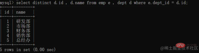 select distinct d.id , d.name from emp e , dept d where e.dept_id = d.id;