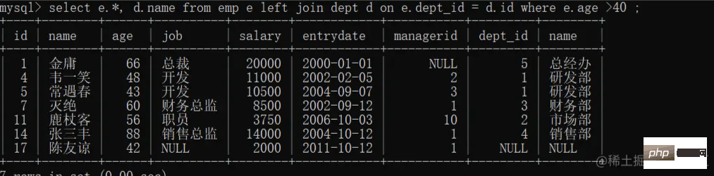 select e.*, d.name from emp e left join dept d on e.dept_id = d.id where e.age >40 ;