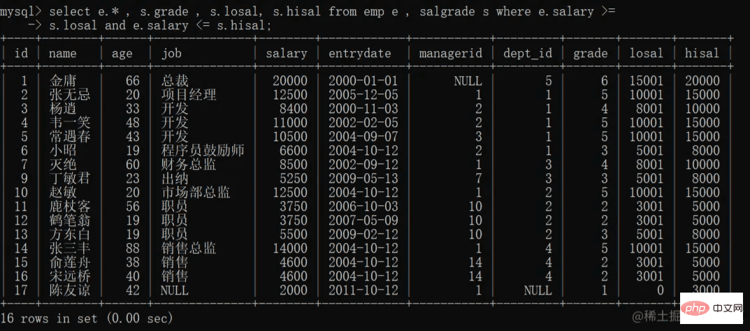-- 方式一 select e.* , s.grade , s.losal, s.hisal from emp e , salgrade s where e.salary >= s.losal and e.salary <= s.hisal; -- 方式二 select e.* , s.grade , s.losal, s.hisal from emp e , salgrade s where e.salary between s.losal and s.hisal;