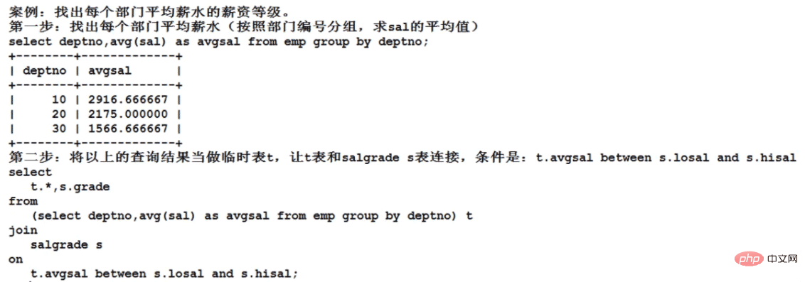 写法一:看作临时表 SELECT t.ename,d.dname FROM dept d JOIN (SELECT e.ename,e.deptno FROM emp e) t ON t.deptno = d.deptno 写法二:连接查询 SELECT e.ename,d.dname FROM emp e JOIN dept d ON e.deptno = d.deptno 写法三:select后嵌套子查询 SELECT e.ename,(SELECT d.dname FROM dept d WHERE d.deptno = e.deptno) AS dept FROM emp e ;