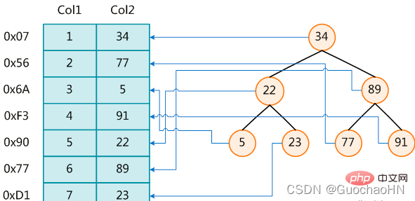 为了加快Col2的查找,可以维护一个右边所示的二叉查找树,每个节点分别包含索引键值和一个指向对应数据记录物理地址的指针,这样就可以运用二叉查找在一定的复杂度内获取到相应数据,从而快速的检索出符合条件的记录。