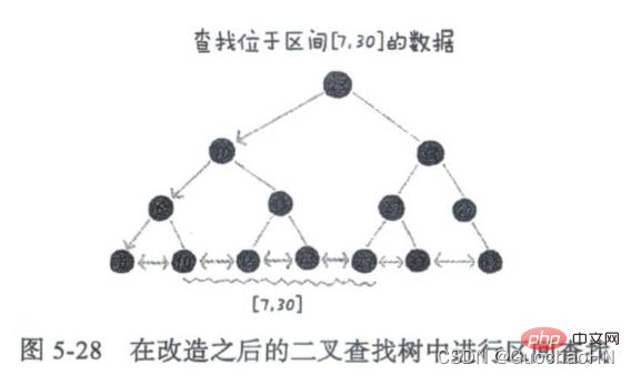 为了支持按照区间快速查找数据,我们对二叉查找树进行改造,将二叉查找树的叶子节点用链表串起来,如果要查找某个区间的数据,只需要用区间的起始值,在树中进行查找,当定位到有序链表中的某个节点之后,再从这个节点开始顺着有序链表往后遍历,直到有序链表中的节点数据值大于区间终止值为止。