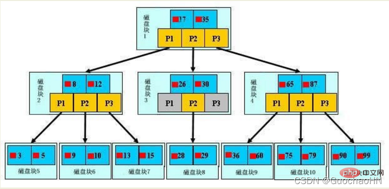 一颗b树,浅蓝色的块我们称之为一个磁盘块,可以看到每个磁盘块包含几个数据项(深蓝色所示)和指针(黄色所示),如磁盘块1包含数据项17和35,包含指针P1、P2、P3。P1表示小于17的磁盘块,P2表示在17和35之间的磁盘块,P3表示大于35的磁盘块。