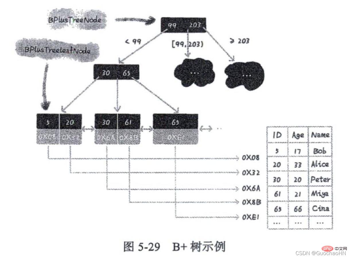 如果要查找数据项29,那么首先会把磁盘块1由磁盘加载到内存,此时发生一次IO,在内存中用二分查找确定29在17和35之间,锁定磁盘块1的P2指针,内存时间因为非常短(相比磁盘的IO)可以忽略不计,通过磁盘块1的P2指针的磁盘地址把磁盘块3由磁盘加载到内存,发生第二次IO,29在26和30之间,锁定磁盘块3的P2指针,通过指针加载磁盘块8到内存,发生第三次IO,同时内存中做二分查找找到29,结束查询,总计三次IO。
