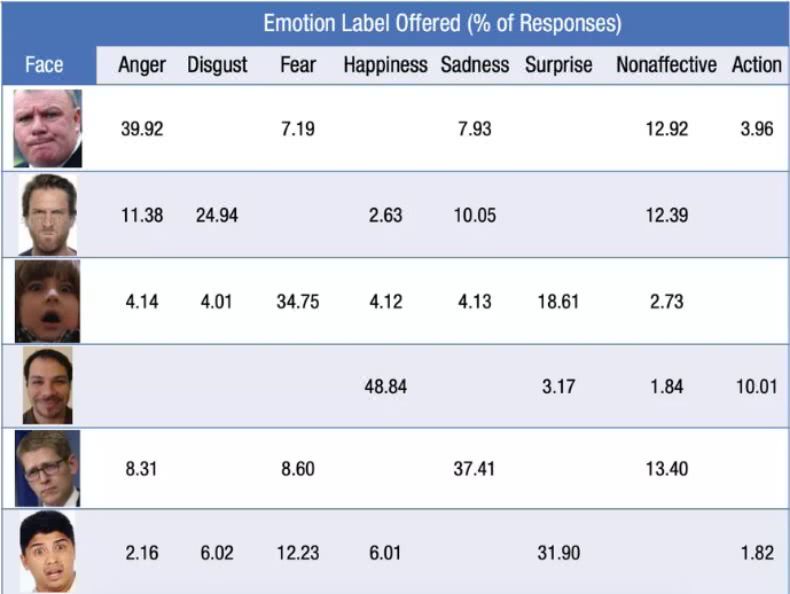 Barrett 说:“数据显示,人们在生气时,平均只有不到30%的时间会皱眉。所以愁眉苦脸不是愤怒的表现,而只是众多愤怒表达之一。这意味着超过70%的情况下,人们在生气的时候不会皱眉。最重要的是,他们在不生气的时候经常会皱眉。”