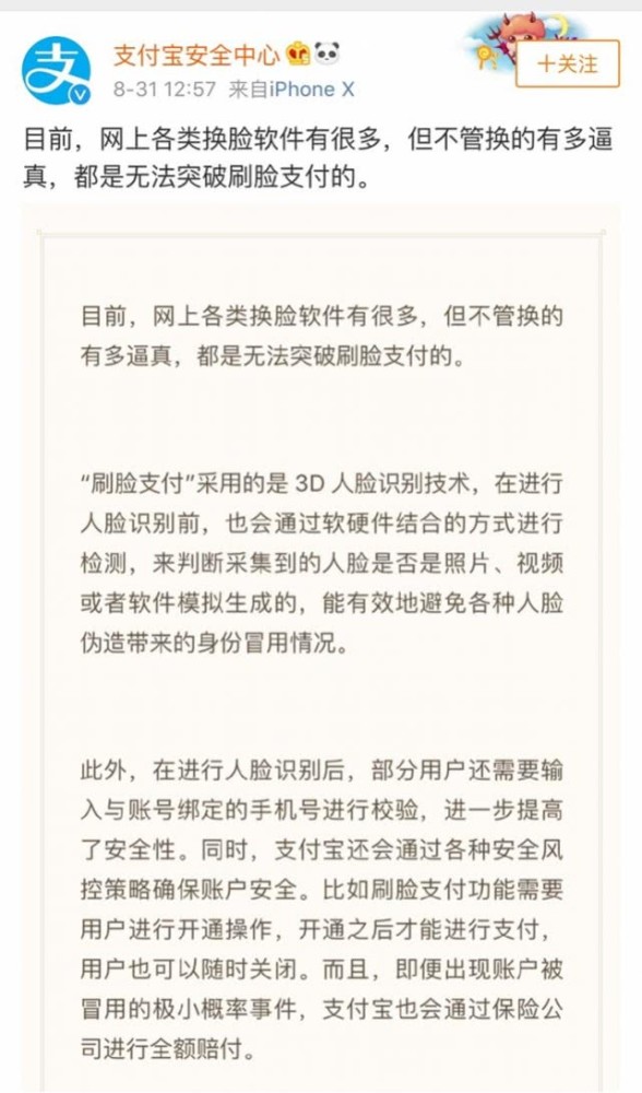 对此,支付宝安全中心8月31日发布公告称,目前各类换脸软件不管换的有多逼真,都无法突破刷脸支付。即便出现账户被冒用的极小概率事件,资金损失也会通过保险公司进行全额赔付。
