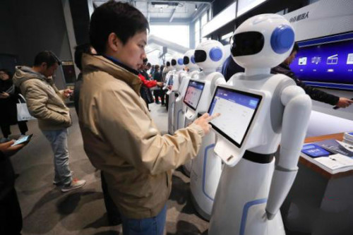 资料图:在浙江乌镇举行的第四届世界互联网大会“互联网之光”博览会上,民众体验人工智能机器人。