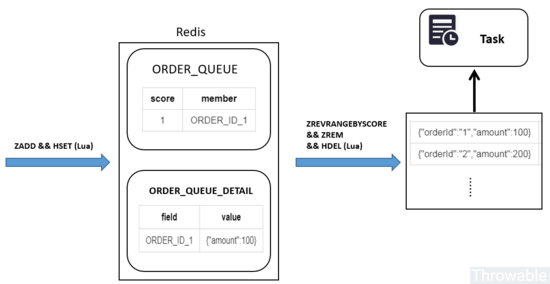 这里其实有一个性能隐患,命令 ZREVRANGEBYSCORE 的时间复杂度可以视为为 O(N) , N 是集合的元素个数,由于这里把所有的订单信息都放进了同一个 Sorted Set ( ORDER_QUEUE )中,所以在一直有新增数据的时候, dequeue 脚本的时间复杂度一直比较高,后续订单量升高之后会此处一定会成为性能瓶颈,后面会给出解决的方案。