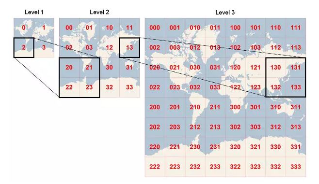 为什么要找到满足条件的最高的geohash网格等级?为什么用九宫格? 这其实是一个问题,本质上是对所有的元素对象进行了一次初步筛选。 在多层geohash网格中,每个低等级的geohash网格都是由4个高一级的网格拼接而成(如图)。