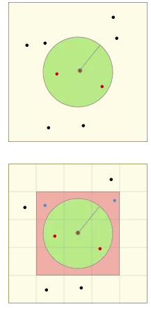 令左图的中心为搜索中心,绿色圆形区域为目标区域,所有点为待搜索的位置对象,红色点则为满足条件的位置对象。