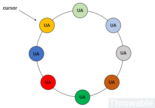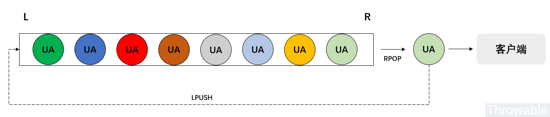 上图中,假设不同颜色的 UA 是完全不同的 UA ,它们通过洗牌算法打散放进去环形队列中,实际上每次取出一个 UA 之后,只需要把游标 cursor 前进或者后退一格即可(甚至可以把游标设置到队列中的任意元素)。最终的实现就是:需要通过中间件实现分布式队列(只是队列,不是消息队列)。