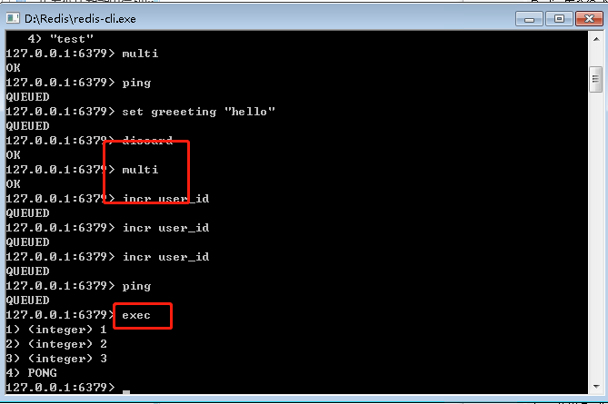 DISCARD取消事务,放弃执行事务块内的所有命令。命令的执行如下所示。先选取一段命令,然后执行该命令取消