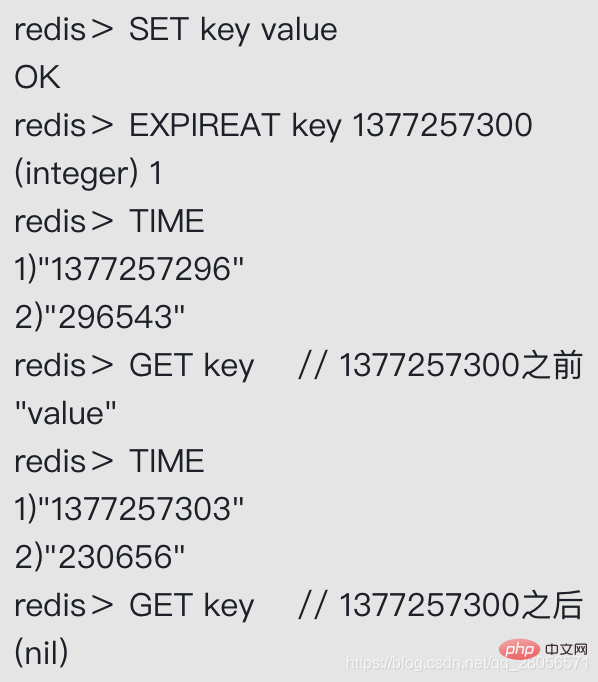 - EXPIREAT<key><timestamp>命令用于将键key的过期时间设置为timestamp所指定的秒数时间戳。