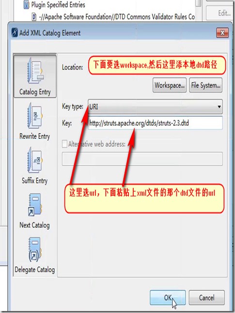 勾选 workspace --》选择本地 dtd 文件的 Location ---》》Key type 选择 URI