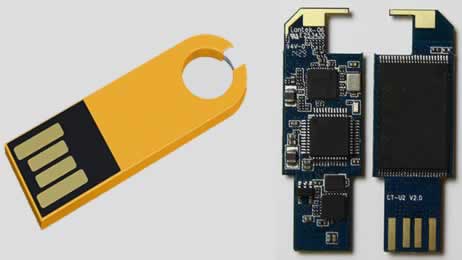 如图所示,U 盘内部也没有类似可旋转磁盘的可活动的部件,在其塑料或铝制外壳内部,主要包含一个嵌有存储芯片的集成电路。因此,U 盘的存储容量通常不是很大(2 GB~128GB)。